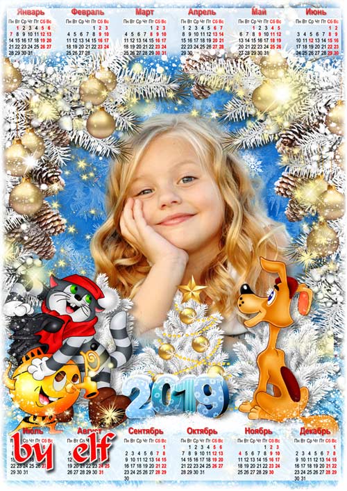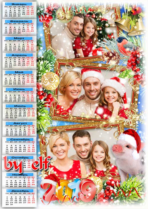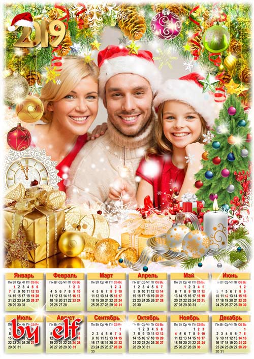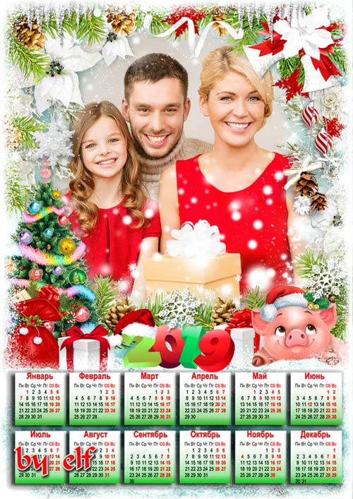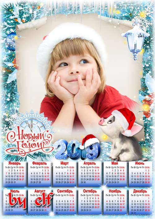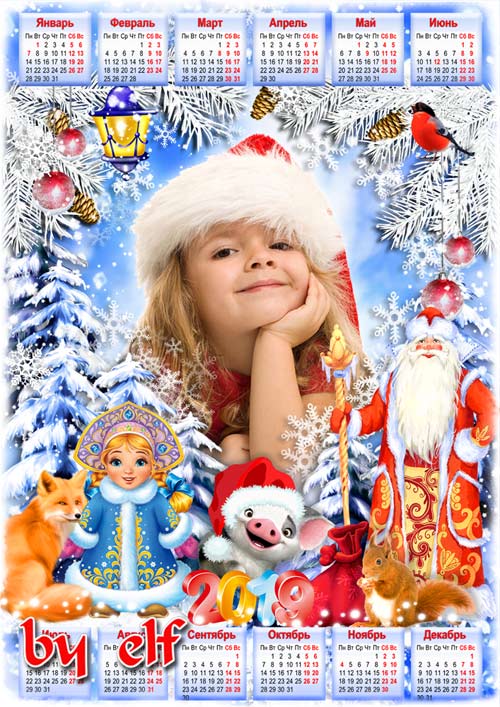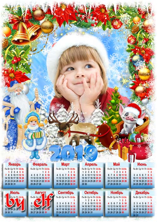 Календарь с фоторамкой на 2019 год с символом года - Здравствуй, елочка и праздник, здравствуй, Дедушка Мороз PSD | 4961х3508 | 300 dpi | 130 Mb Автор: lunar.elf