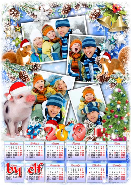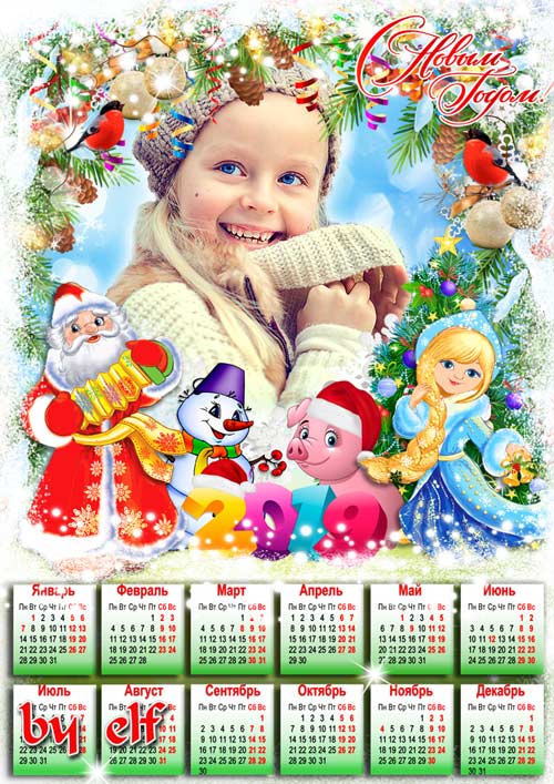 Календарь-рамка на 2019 год - Поздравляем с Новым Годом!Пусть веселым хороводом пролетит Свинюшки Год PSD | 4961х3508 | 300 dpi | 107.6 Mb Автор: lunar.elf