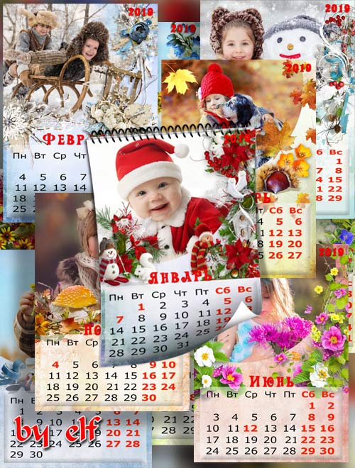 Календарь с рамками для фото на 2019 год, на 12 месяцев - По листкам календаря ходят друг за другом месяцы по кругу 12 png | 4961х3508 | 300 dpi | 170.5 Mb Автор: lunar.elf