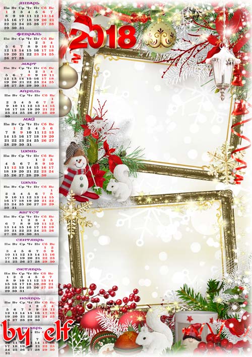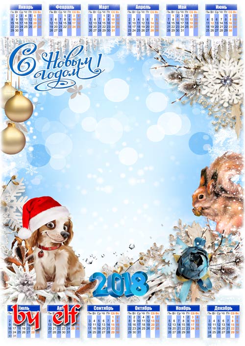 Новогодний календарь-рамка на 2018 год - Пусть обходят все ненастья, жизнь одарит вас сполна PSD | 4961х3508 | 300 dpi | 110 Mb Автор: lunar.elf