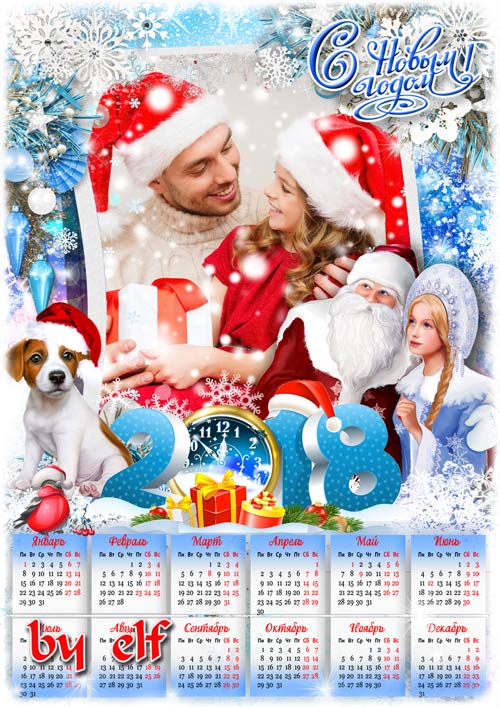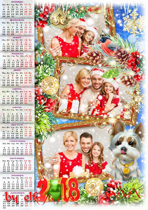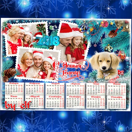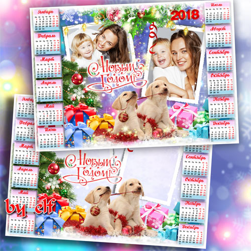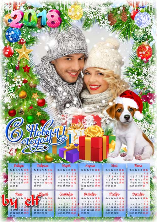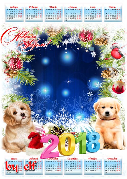 Новогодний календарь-рамка на 2018 год с Собаками - С Новым Годом поздравляем, пусть счастливым будет он PSD | 3508х4961 | 300 dpi | 100 Mb Автор: lunar.elf