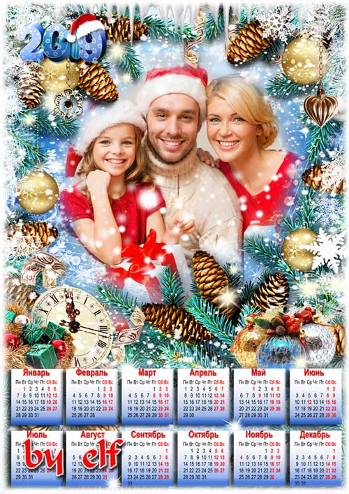 Календарь с рамкой для фото на 2019 год - Под бой курантов звонкий пусть счастье в каждый дом влетит PSD | 3508х4961 | 300 dpi | 127.4 Mb Автор: lunar.elf