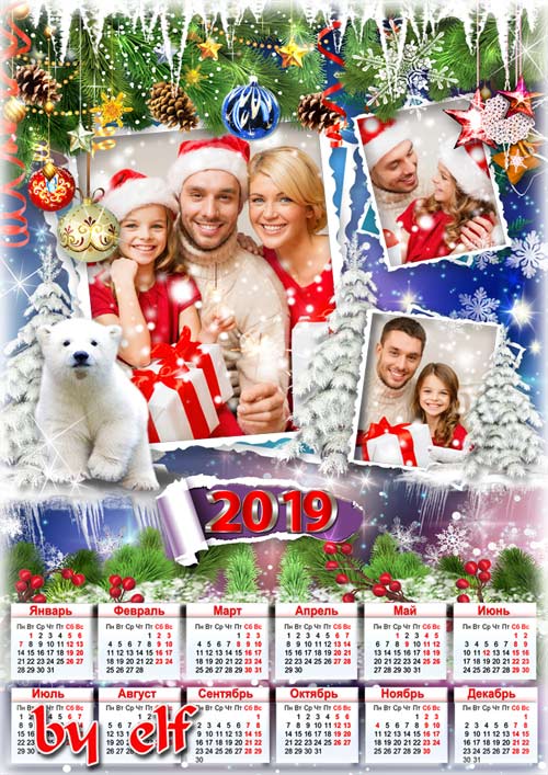 Календарь с рамками для фото на 2019 год - Пусть тают снежинки, пусть тают сердца, пусть сказке волшебной не будет конца PSD | 3508x4961| 300 dpi | 112 Mb Автор: lunar.elf