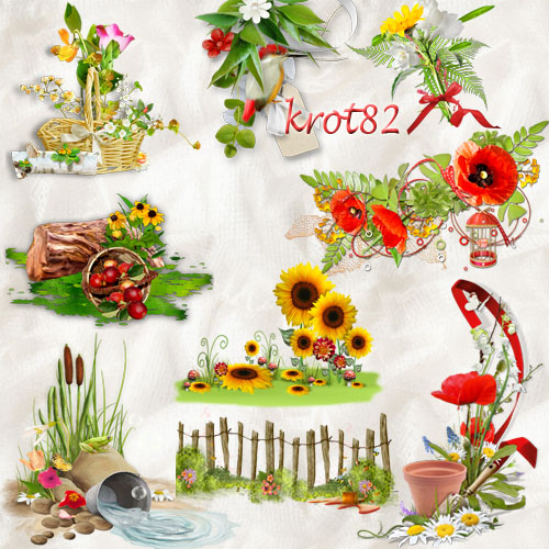 Кластеры летние, клипарт летний с травой, цветами и ягодами для открыток и коллажей – Яркие краски лета 56 png| 300 dpi |161 MB